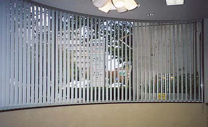 曲線の窓辺にはタテ型ブラインド、おしゃれですね~。カーブ仕様のタテ型、広い開口部こそ縦型はオススメです。スッキリ感、シャープ感がカーテンではイマイチ、シェードも無理があります、そんな時はタテ型のブラインドが1番。